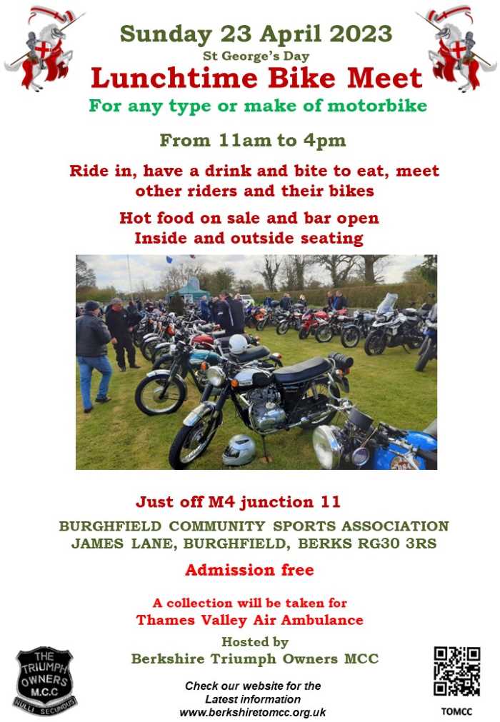 We are having a Lunchtime Bike Meet on Sunday 23 April. It’s a great opportunity to meet other riders , see their bikes and have lunch and a drink together to kick off the new riding season. All motorcycle and riders are welcome. As of Sunday morning, BBC Weather forecast for Reading area showing sunshine and low chance of rain between 11am and 4pm. So looking good!!!